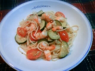 スパゲティー150g えび10尾 ズッキーニ1本 ミニトマト10個 にんにく1片