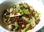 玉ねぎがしんなりしたら肉と酢を加える。