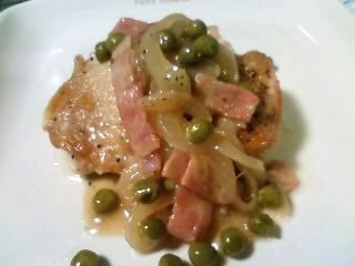 鶏モモ肉1枚 玉ねぎ(うす切り)1/2個 ベーコン2枚 にんにく(潰す)1片