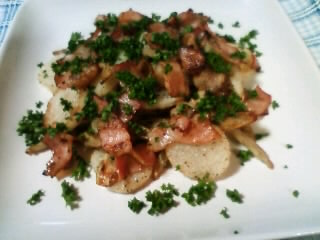 器に盛りベーコンとパセリを散らす。
