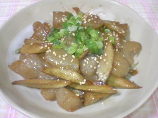なすは乱切りにして水に放しアクを抜き水気を切っておく。豚肉は3cm幅に切る。