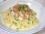 茹でたスパゲティーを加え和える。器に盛って三つ葉をのせ、ごまを散らす。