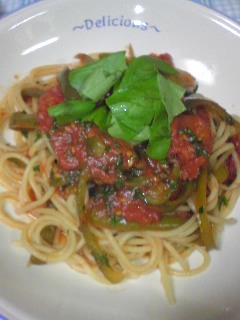 スパゲティー160g ピーマン4個 ホールトマト1缶 赤ワイン50cc