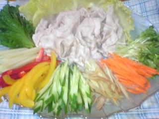 大き目の鍋で湯を沸かし、豚肉をしゃぶしゃぶの要領で1枚づつ湯を