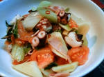 フライパンにオリーブオイルを熱しにんにくを炒め、色づいたら取り出す。