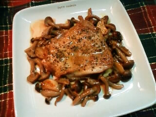 鶏モモ肉1枚 しめじ1/2袋 にんにく3片 塩・粗引きコショー各少々 醤油大1