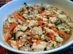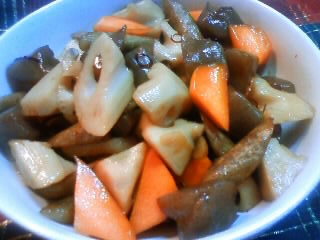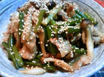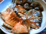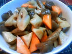 しめじを加えてさっと炒め、水・醤油・にんにくを加え弱火で10分ほど煮込む。